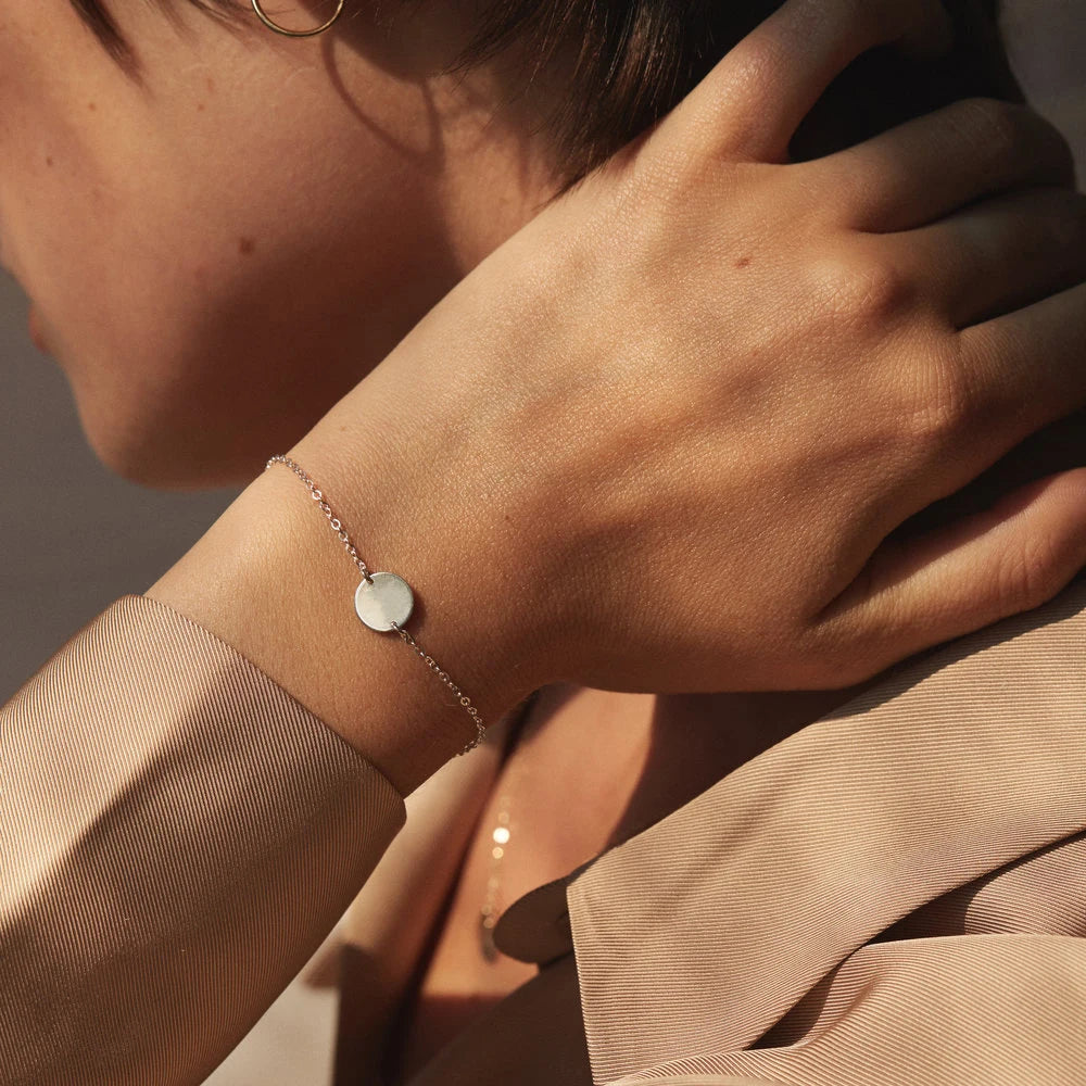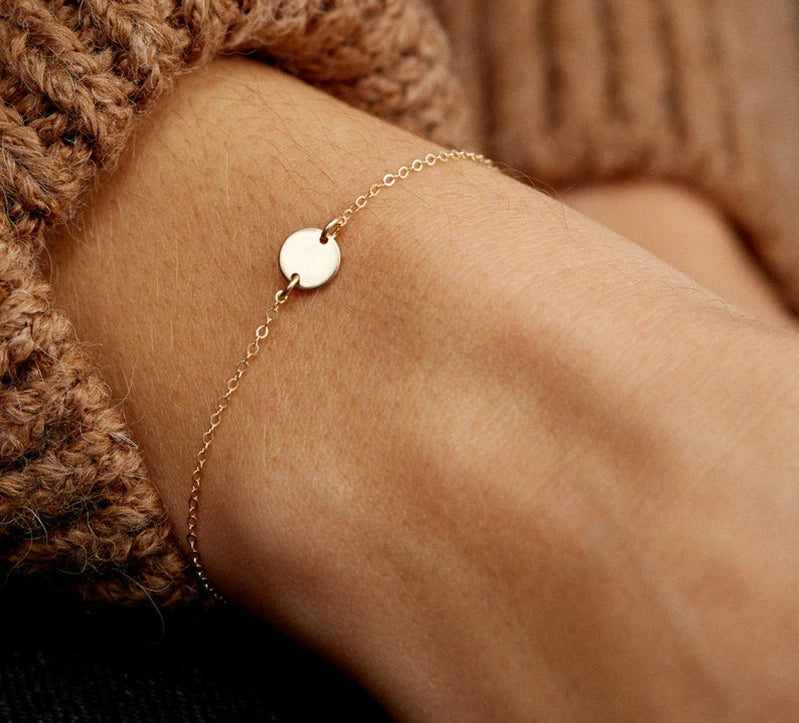 Get ready to charm everyone with this minimalist disc bracelet! Made of stainless steel, this waterproof bracelet adds a touch of elegance to any outfit. Keep it simple and stylish with our charm bracelet.